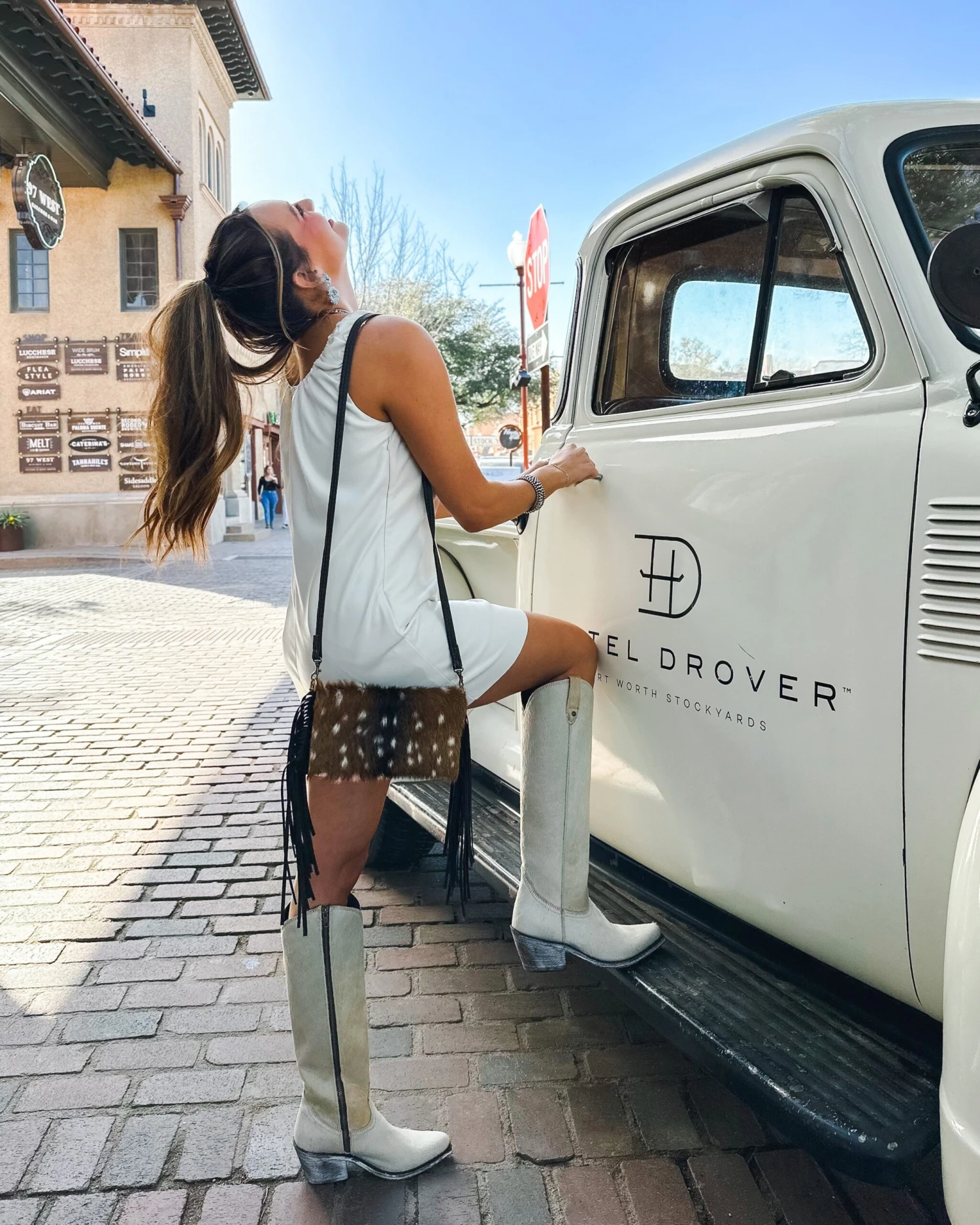The magnetic closure ensures the safety of your belongings while providing easy access to the interior. The front of the purse features a stunning layer of soft, luxurious fur that adds texture and dimension to the design, while the sides are adorned with playful fringe that moves and sways with your every step.