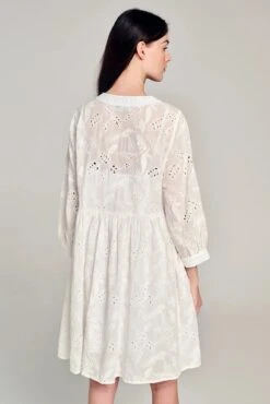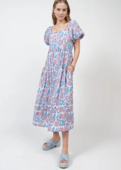 This trendy denim dress features a line bodice with button down closure on the front. Front double pocket with a criss cross back finishing.