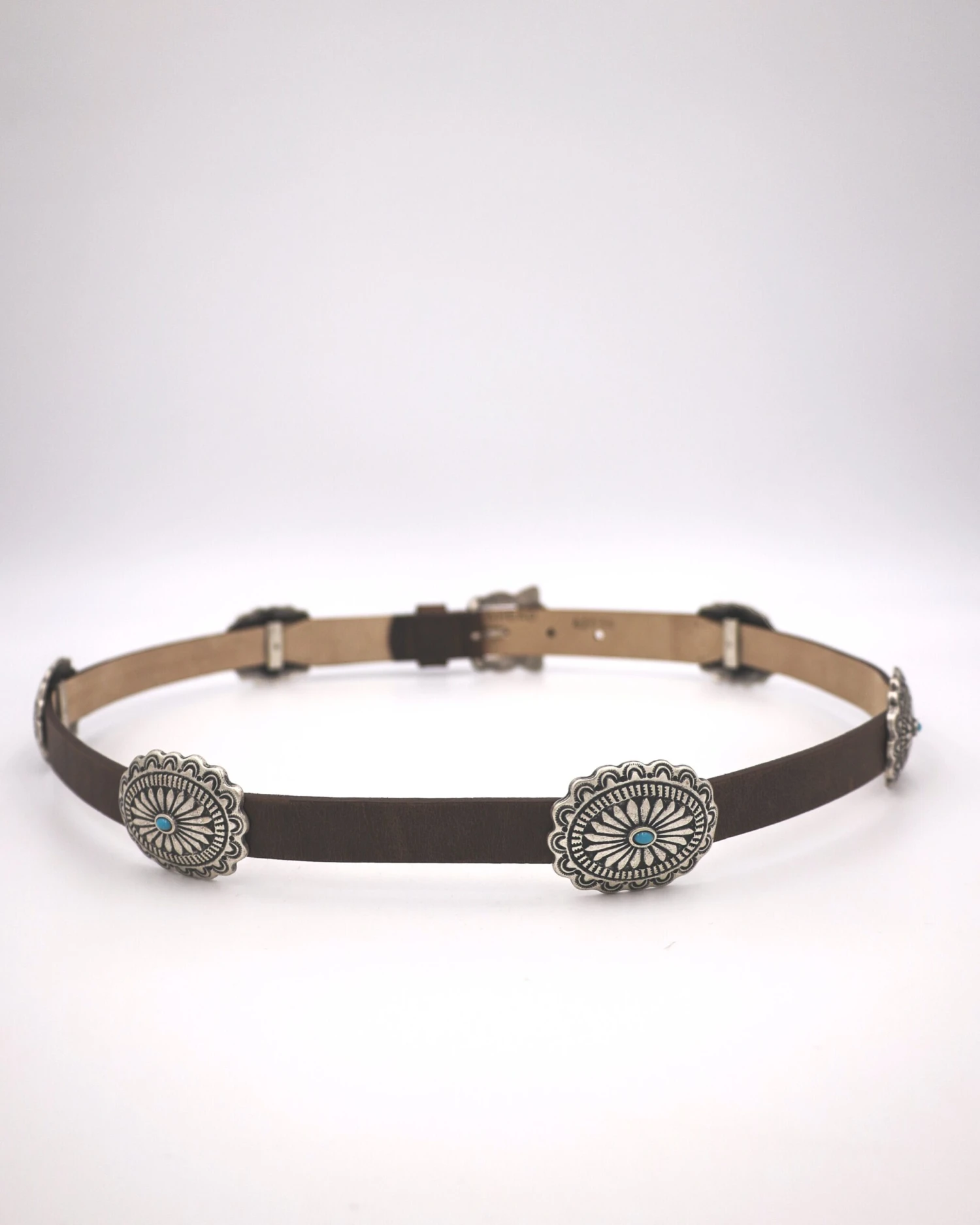 Our Concho With Turquoise Stones Belt Belt is detailed with antique silver conchos and turquoise stones