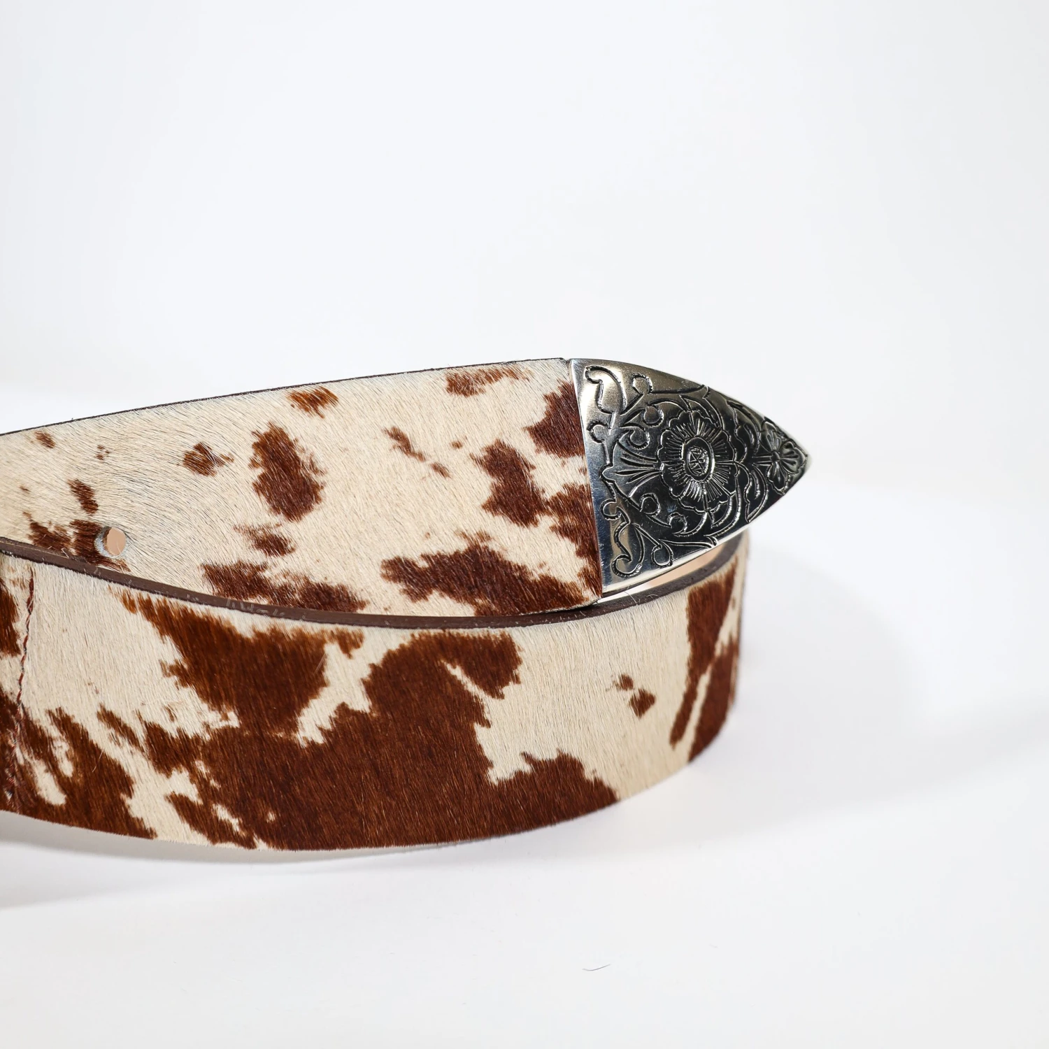 Brown and white hair on cowhide belt with oversized antique silver western buckle set.