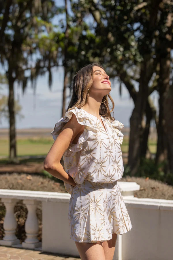 The Maggie Top is feminine and fun! An effortlessly flirty silhouette complimented with signature flutter sleeves. Featured in our Gold Burst print. The Gold Burst Maggie is the perfect summer neutral with gold detail. Pair with white denim or our new Party Shorts in Gold Burst for a perfect matching set!