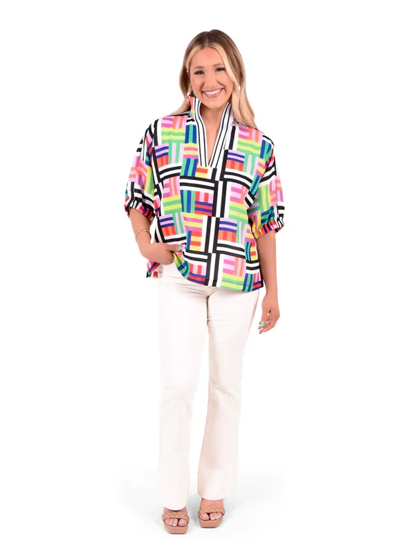 Our signature Poppy Top in Madras. Loose-fitting with an optional stand up collar. Would pair great with a pair of white denim jeans or shorts for this summer! Dress up with a heel or go casual with a sneaker, the Poppy Top is versatile for every style!