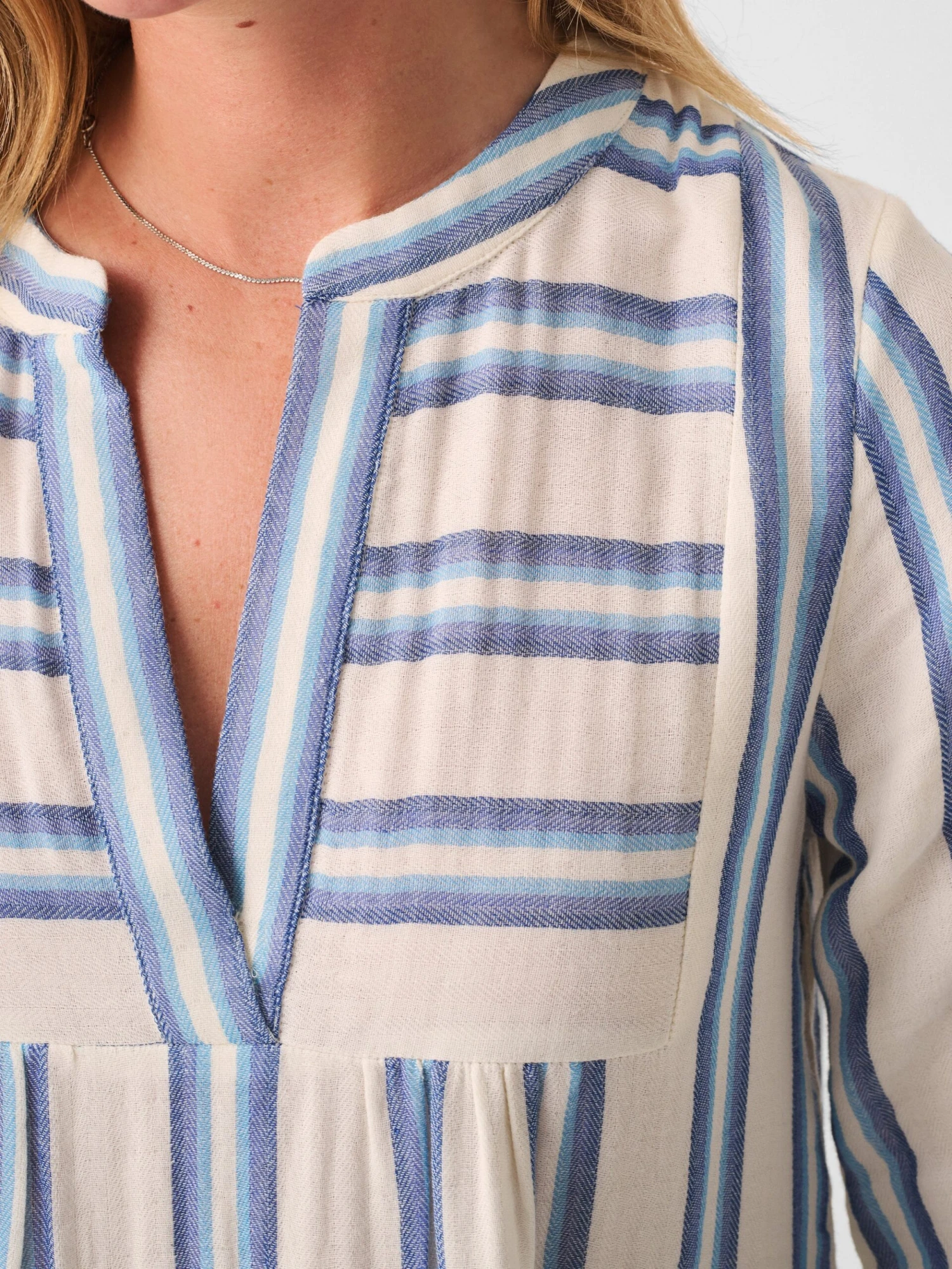 - Detail:Â Custom yarn-dyed stripe. Front bib with shirring. Contoured collar band with overlapping front placket. Bell sleeve with slight shirring. Tiered skirt with ruffles at each tier.