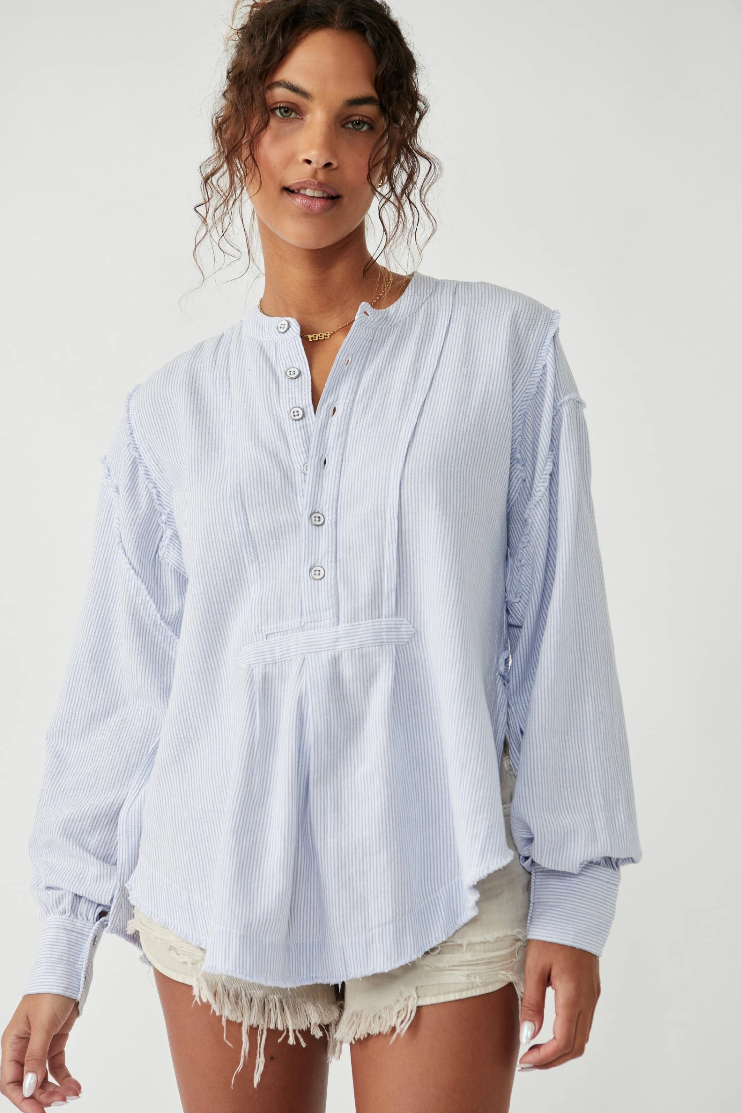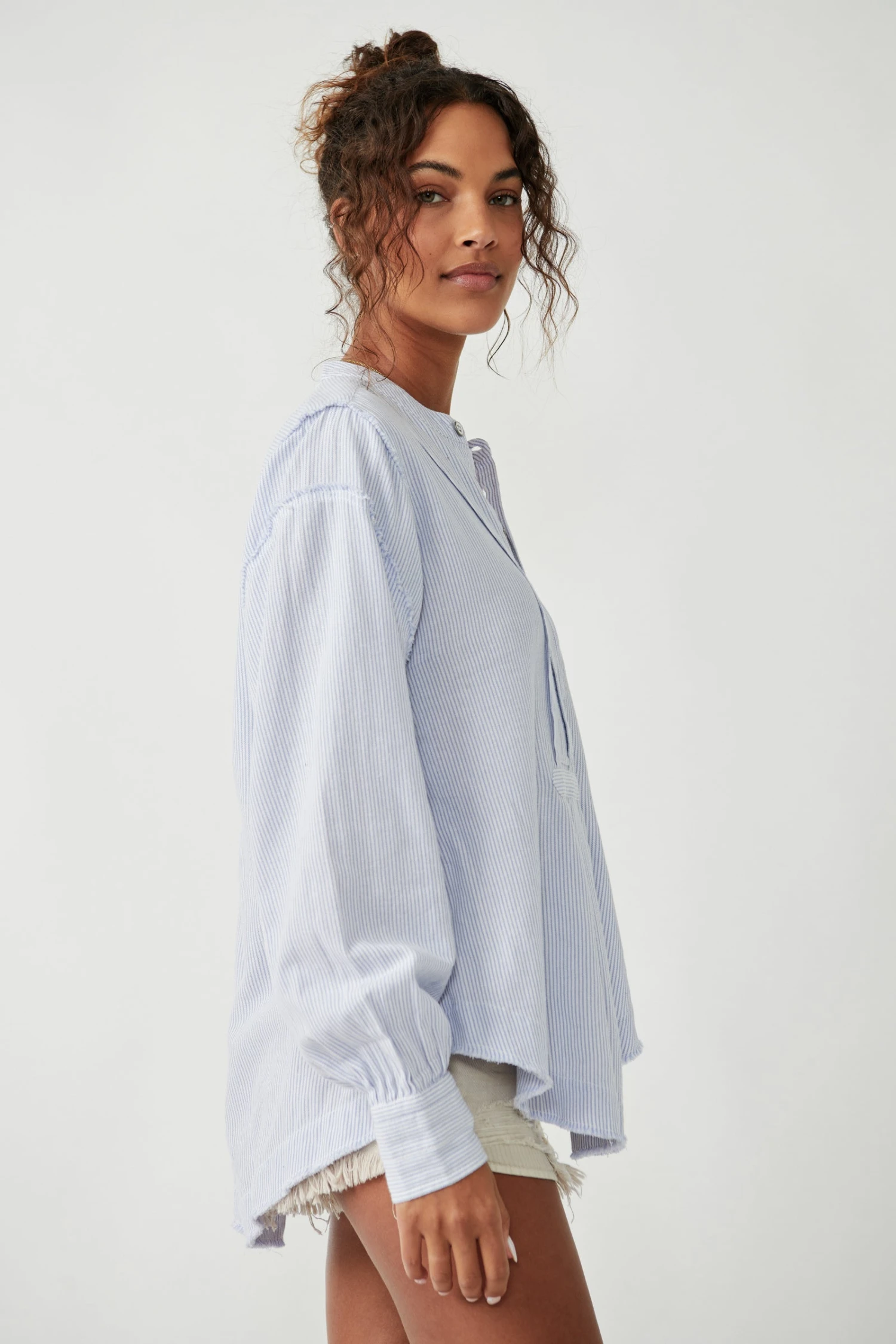Essentially Effortless! The Edge Washed Shirt is a sweet, striped shirt that features a v-neckline and button closure.