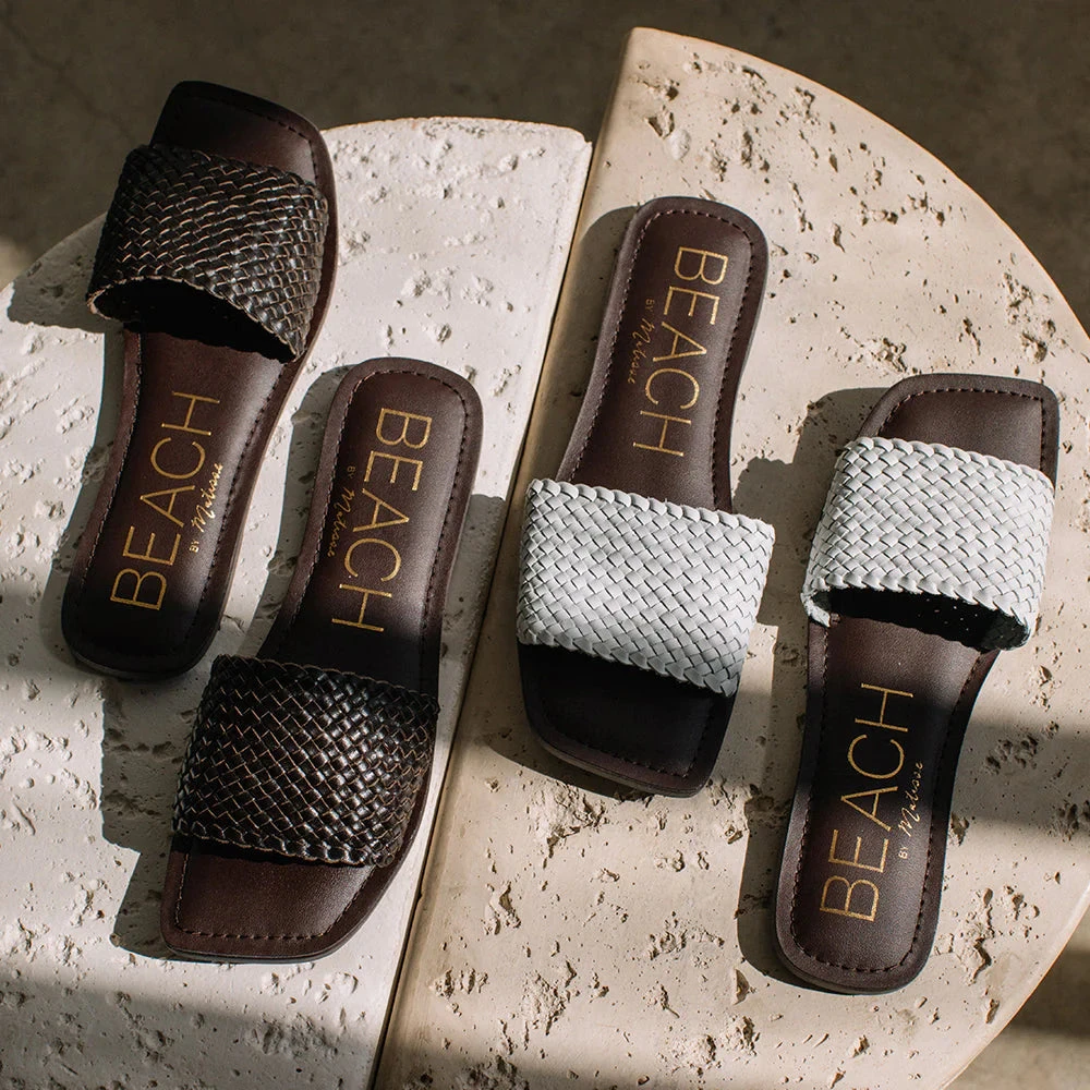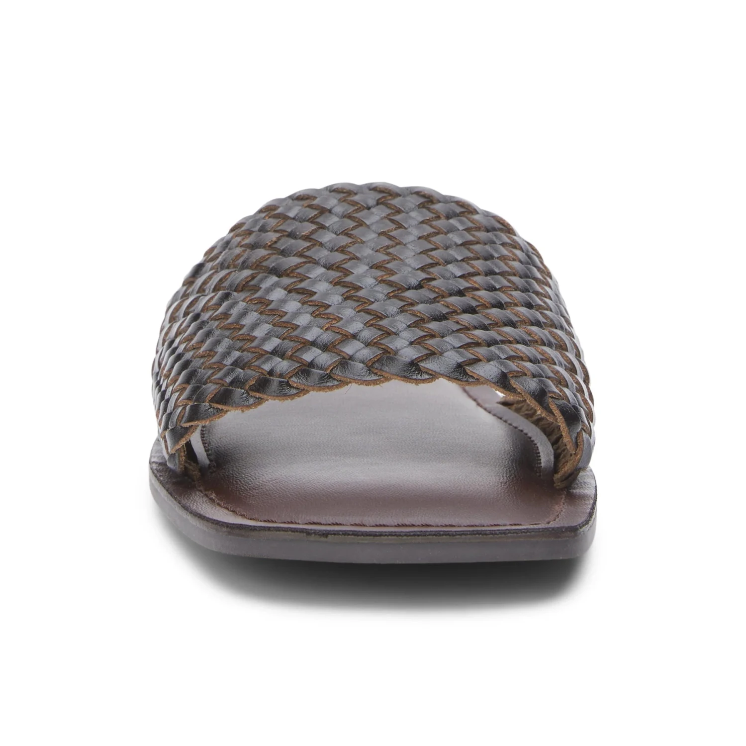 Flat, single-band slide sandal with woven leather upper.