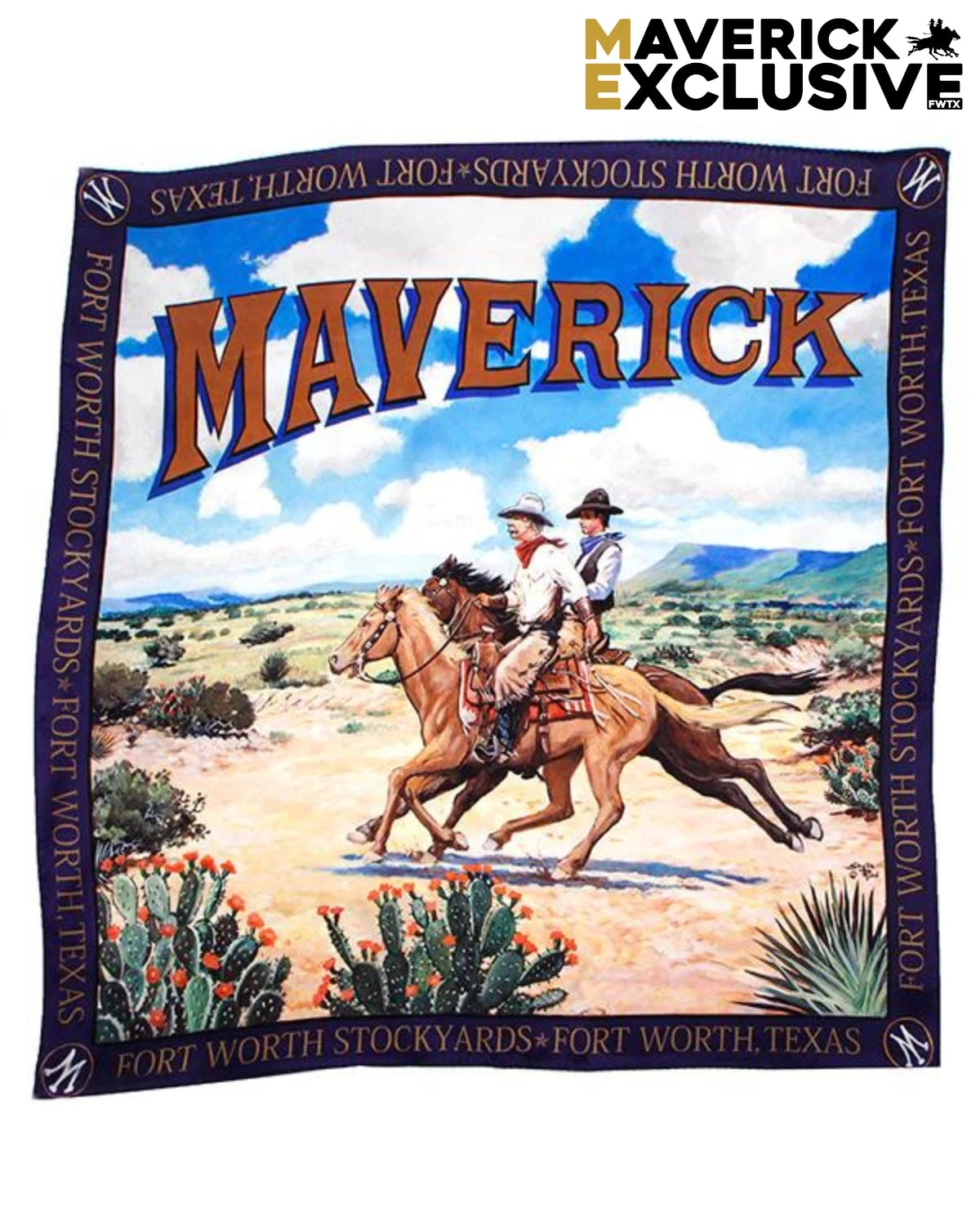 Custom made for The Maverick! This gorgeous silk wild rag features a portion of our iconic mural located on the side of our building. The image is a replica of a custom piece of art Texas muralist, Stylle Read, created exclusively for The Maverick! Measures 35-1/2″ wide by 35-1/2″ long. Also available in small and medium.