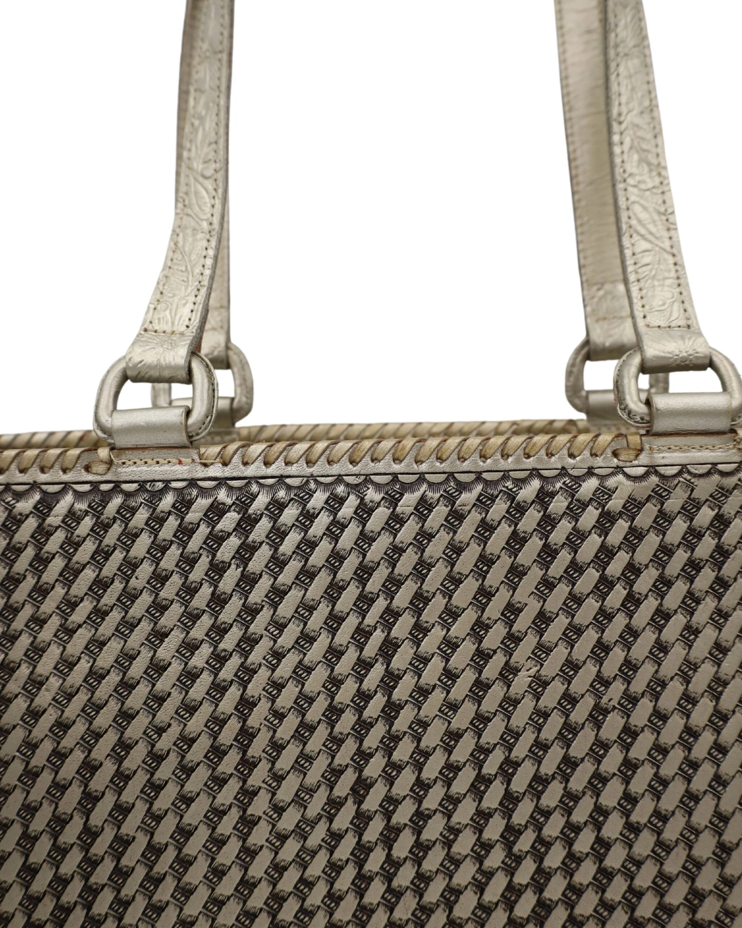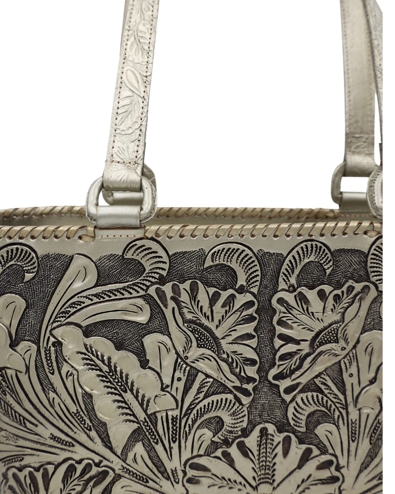 Sophisticated hand tooled leather purse from Mexico. Featuring a beautifully intricate floral design on the front and leather braiding design on the back. It also contains a zip closure and suede interior with an interior zipper pocket and 2 interior slip pockets.
