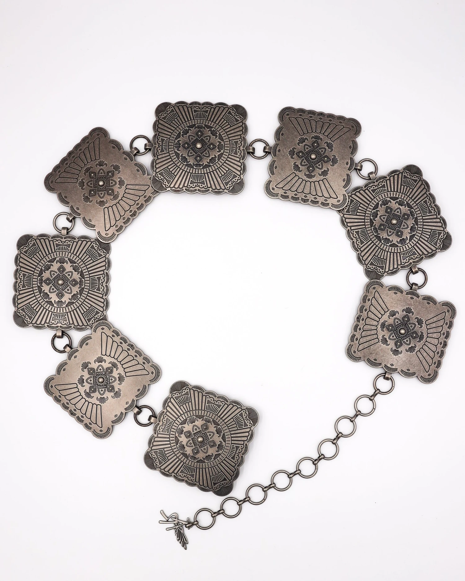 Angel Ranch Ladies belt by M&F Western Products. Chain style belt with a floral engraved design on 3” square conchos. Silver. Conchos Measure: 3”. Floral Design.