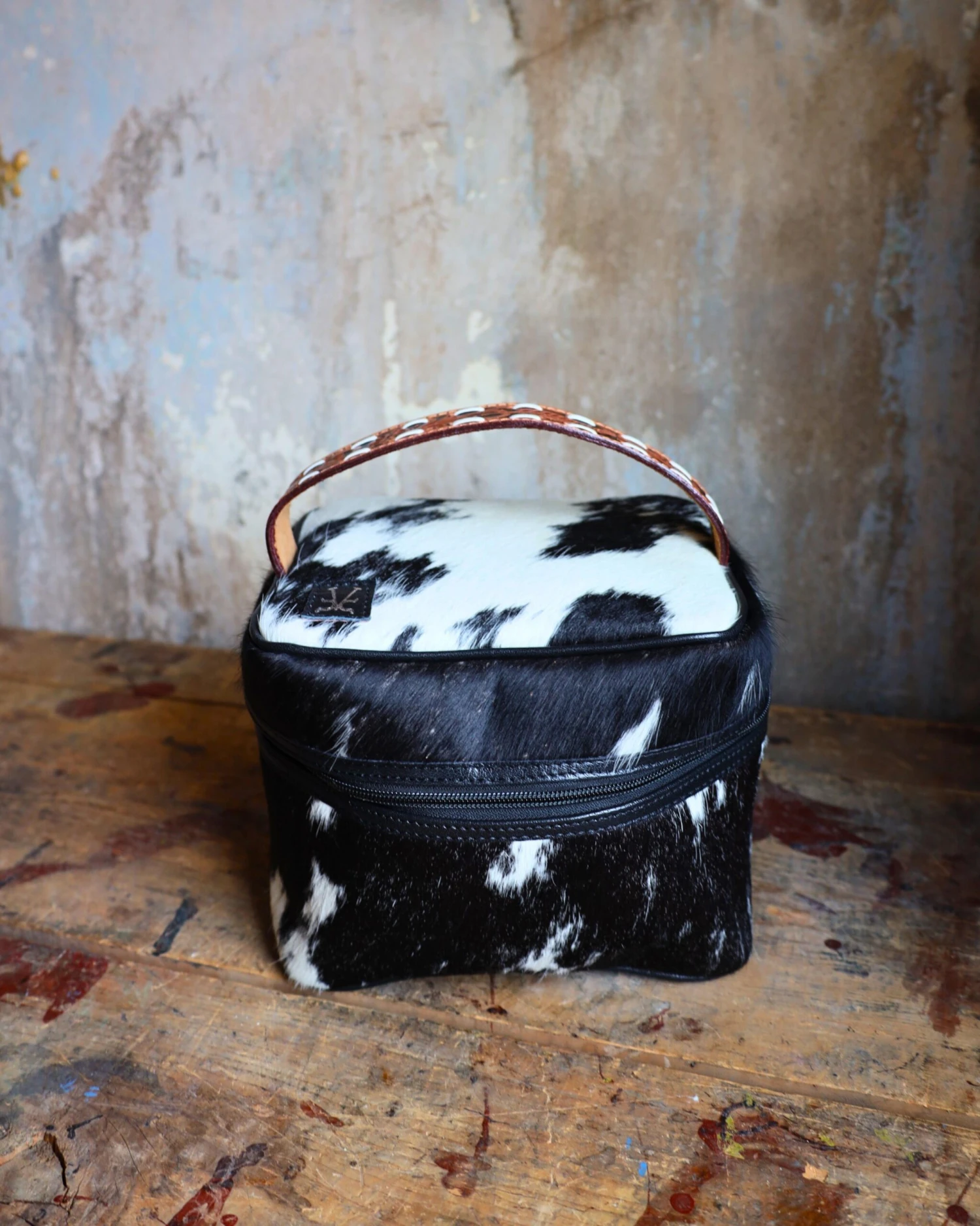 Black leather with black/white cowhide Stand up zippered toiletry case with tooled leather, white buckstitch handle. This measures 8” x 7” x 6”. This little case holds a lot. I use it for my toiletries, hubby carries his toiletries, meds, and lite change of clothes.
