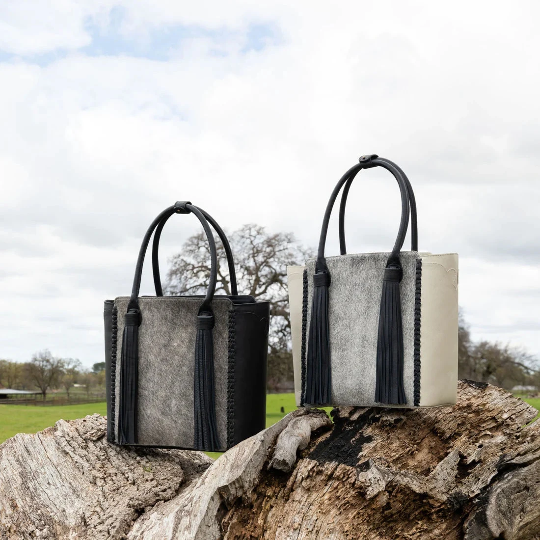 A city slicker’s western wear dream tote! The Uptown Tassel Tote fuses structured leather, beautiful handpicked cowhide, and dramatic tassels to create an oversized bag that’s as chic as it is functional. Intricate laced stitching and western appliqué side details add just the right amount of cowgirl flair, and a big back pocket makes grabbing essentials easy. Available in both light and dark hide options. Designed right here in the USA for cowgirls everywhere.Â