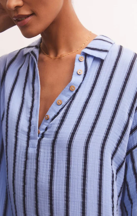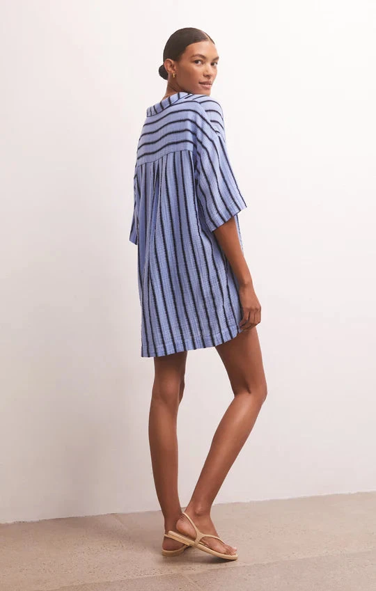 The Beatrix Stripe Mini Dress is the perfect dress to throw on and go! Designed in our 100% Cotton Textured Gauze with a beachy stripe pattern, this collared, oversized style features a half button front, center back yoke, and side slits. Add a belt for a more fitted look.